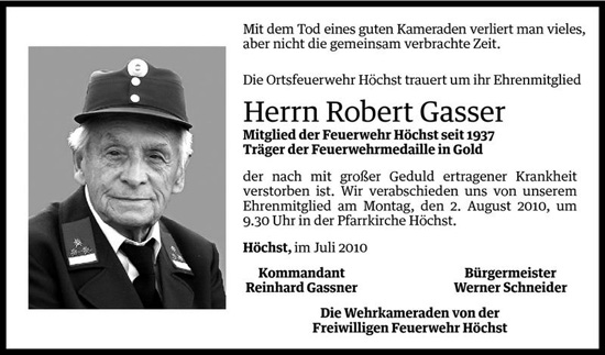 Unsere Chronik besagt, dass Robert Gasser beinahe 74 Jahre Mitglied unserer Wehr war, er wurde für seinen langjährigen Dienst mit der Feuerwehrmedaille in Bronze, Silber und Gold sowie mit dem Verdienstkreuz des Landes Vorarlberg in Bronze ausgezeichnet. Im Jahre 1974 wurde Robert zum Ehrenmitglied der Feuerwehr Höchst ernannt.