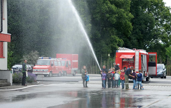 Natürlich macht es immer wieder Spaß, wenn Kinder selbst Löschwasser spritzen können. Dazu haben sie beim Besuch bei der Feuerwehr auch reichlich Gelegenheit. Das galt heuer wieder für die 3. Klassen der Volksschulen Unterdorf und Kirchdorf.