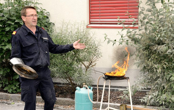 Auf keinen Fall darf Wasser zum Einsatz kommen, wenn etwa das Fett in der Pfanne auf dem Herd zu brennen beginnt. Damit löst man lediglich eine gewaltige Stichflamme aus. Auch das konnten die Höchster Volksschüler genau beobachten. Ist kein Feuerlöscher zur Hand, können die isolierten Backhandschuhe in Mutters Küche Dienste leisten, wenn die Pfanne samt brennendem Öl ins Freie gebracht wird. Armin Schneider: „Dabei unbedingt rückwärts gehen, weil die Flammen sonst ins Gesicht schlagen!”