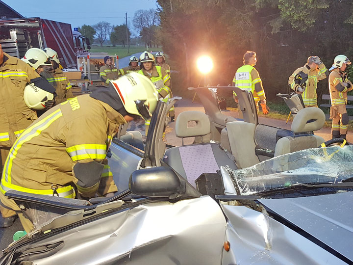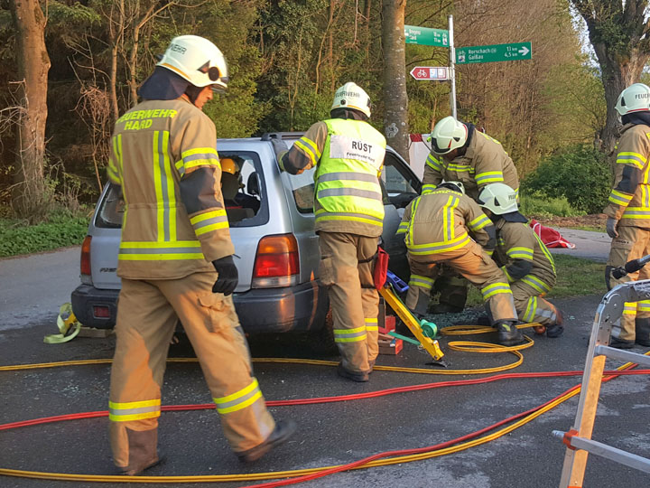 Übungsannahme: ein Auto kommt bei der Flughalle von der Straße ab, überschlägt sich mehrfach. Personen sind eingeklemmt und aus dem inneren kommt Rauch. Von der Feuerwehr Höchst wurde die Unfallstelle abgesichert, die Personen versorgt und der Brand gelöscht. Mit Hilfe der Kameraden der Feuerwehr Hard wurden anschließen die Personen schonend aus dem Fahrzeug geborgen.