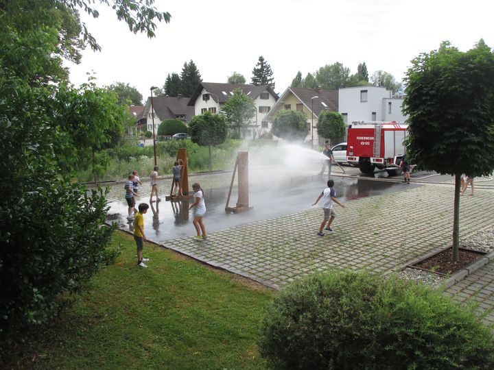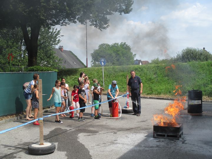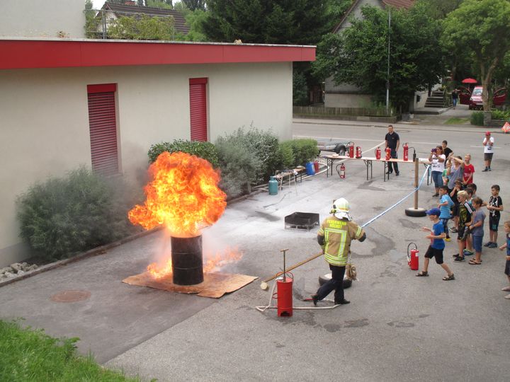 Zu sehen gab es alles was mit der Feuerwehr zu tun hat, so zum Beispiel eine Präsentation über die Feuerwehr, die Bekleidung, ein Zielspritzen, einen verrauchten Raum, löschen mit einem Feuerlöscher und selbstverständlich auch das Mitfahren in einem Feuerwehrauto.