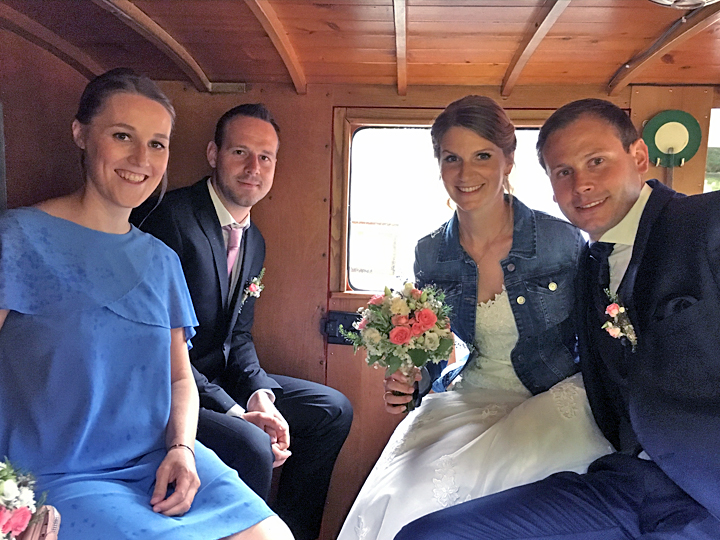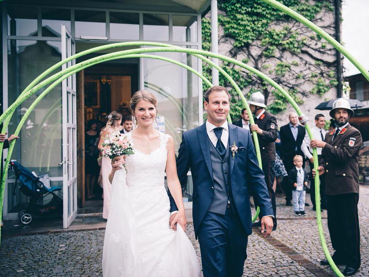 Die Kameraden der Feuerwehr Höchst empfingen das Brautpaar nach der Trauung und bildeten einen Schlauch-Spalier. Zum Blumenstrauß für die Braut wurde mit Sekt angestoßen. Unser Muk diente als Hochzeitsfahrzeug und brachte das Brautpaar nach der Trauung sicher von der Fluh zum Kaiserstrand nach Lochau.