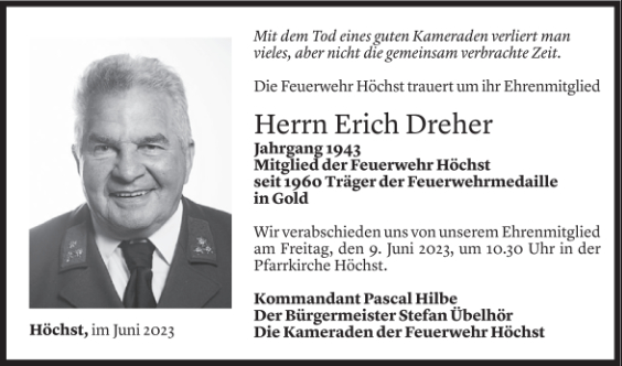 Was uns bleibt, ist, dir lieber Erich, ein letztes Mal „Danke“ zu sagen für deine Kameradschaft und deine Einsatzbereitschaft für die Höchster Bevölkerung.