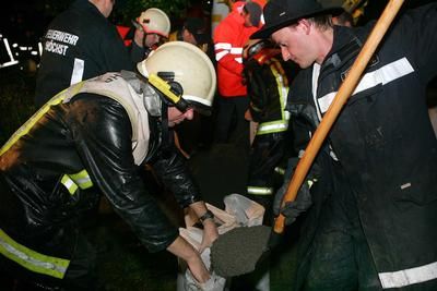 | Nach längeren Regenfällen gab es in verschiedenen Gebieten in Vorarlberg Hochwasser. So auch in Hohenems, hier traten mehrere Bäche über die Ufer, unter anderem auch der Rheintalbinnenkanal. Da es bei uns in Höchst ruhig war und wir trotz der intensiven Regenfällen keine Einsätze zu verbuchen hatten, wurden wir zur nachbarlichen Hilfeleistung nach Hohenems gerufen. Hier drohte der Rheintalbinnenkanal eine Wohngegend zu überfluten. Da es in Hohenems zu dieser Zeit zahlreiche andere Einsätze gab, übernahmen die Feuerwehren Lustenau und Höchst die Sicherung der Ufer mittels Sandsäcken, diese wurden von uns befüllt und verlegt.
