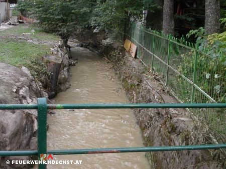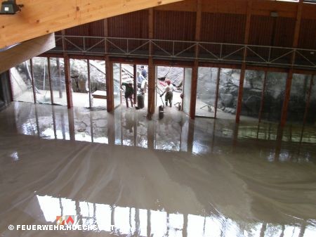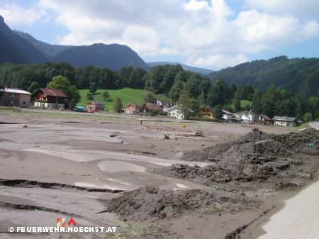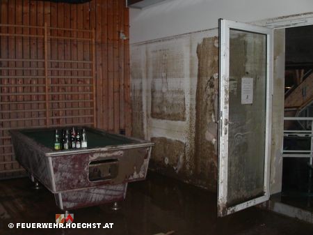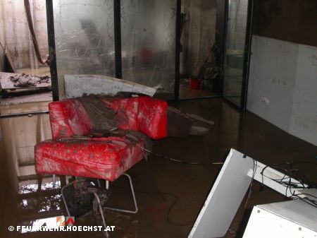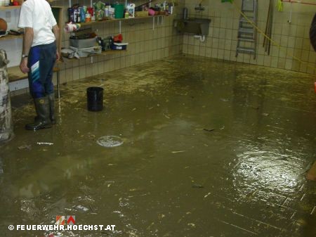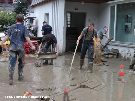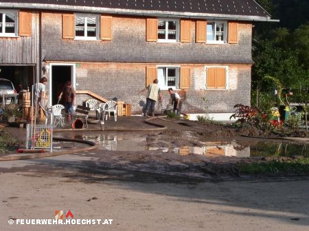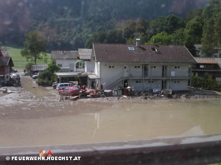 | Nach der Hochwasserkatastrophe in Vorarlberg hilft die Freiwillige Feuerwehr Höchst bei den Aufräumarbeiten im Bregenzerwald mit. Am Tag eins nach der Flut lag unser Einsatzgebiet in Schnepfau, hier werden überflutete Keller ausgepumpt und bei div. Aufräumaktionen mitgeholfen, so zb. in der Schule und in zahlreichen Privathäusern, da hier der gesamte Ortskern unter Wasser stand. An diesem Tag waren wir von 13:00 – 23:00 Uhr mit 17 Mann und drei Fahrzeugen im Einsatz. Am Tag zwei, dem 25.08.05 ist unser Einsatzort Bezau, hier waren wir in Zusammenarbeit mit der Feuerwehr Fußach wiederum bei der Beseitigung der Schäden am helfen. Abfahrt in Höchst: 7:00 Uhr, Ankunft: 19:30 Uhr, Mannschaft: 13 Einsatzkräfte. Tag drei und vier, 26. und 27.08.05: Wiederum Hilfeleistung mit Schwerpunkt überschwemmte und verschlammte Keller in Bezau. Größtes Objekt war die Tennishalle des Hotel Post, welche ca. sieben Meter überflutet wurde und nun einer Baustelle gleicht. Mannschaft: je 10 Einsatzkräfte. Insgesamt wurden 511 Stunden aufgewendet!!!