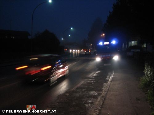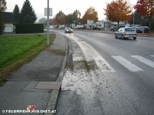 | Zirka 50 Liter Hydrauliköl auf der Bundesstraße L202 in Höchst. Ein Arbeiter einer Firma die im Auftrag des Landesstraßenbauamtes Mäharbeiten durchführt war auf der Bundesstraße L202 in Höchst, in Fahrtrichtung Bregenz mit Mäharbeiten mittels Hydraulischem Mähwerk beschäftigt. Auf Höhe Mazda Hagspiel kam es zu einem Defekt an der Hydraulik, welchen er leider erst nach zirka einem Kilometer, kurz vor dem Blum Werk 5 bemerkte. In der Zwischenzeit flossen nach Angaben des Fahrers mindestens 50 Liter Hydrauliköl auf die vielbefahrene Straße. Die Feuerwehr Höchst war mit drei Fahrzeugen und sieben Mann im Einsatz. Besondere Gefährlich wurde dieser Einsatz durch die Dunkelheit und den Nebel welcher Zeitweise eine Sicht von maximal 50 Meter zuließ.