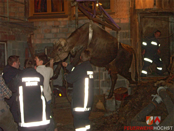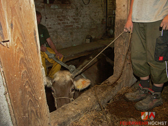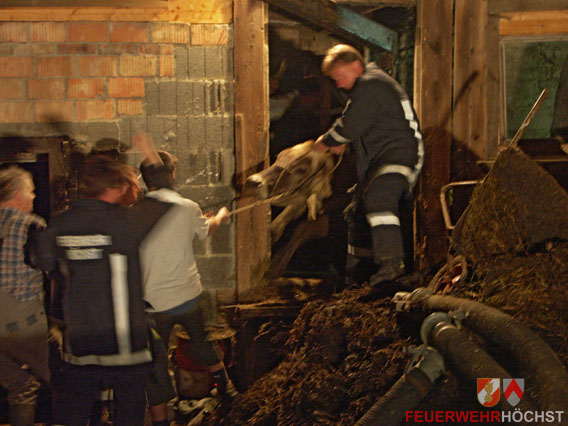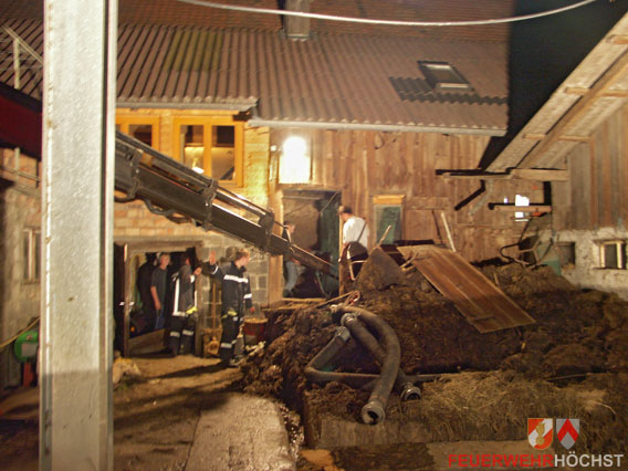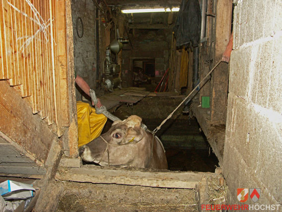 Nach dem ein Landwirt vergeblich versuchte eine Kuh aus einer Jauchegrube zu befreien, alarmierte er die Feuerwehr Höchst.