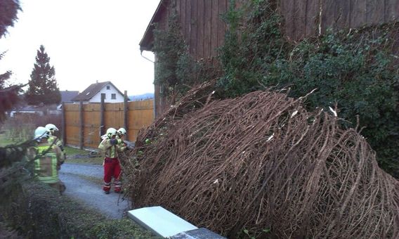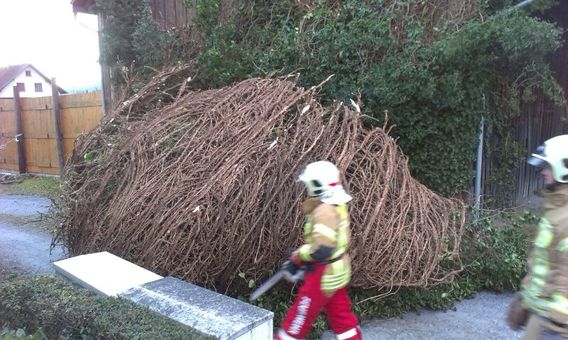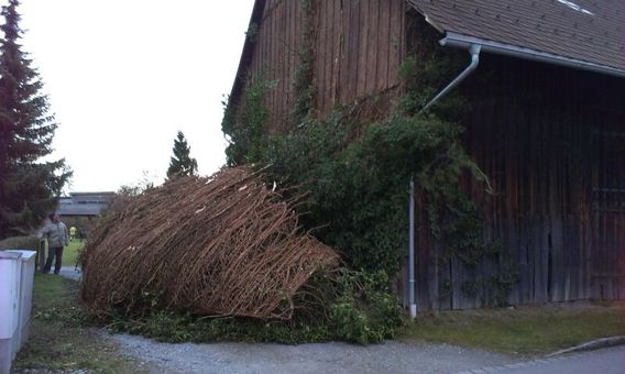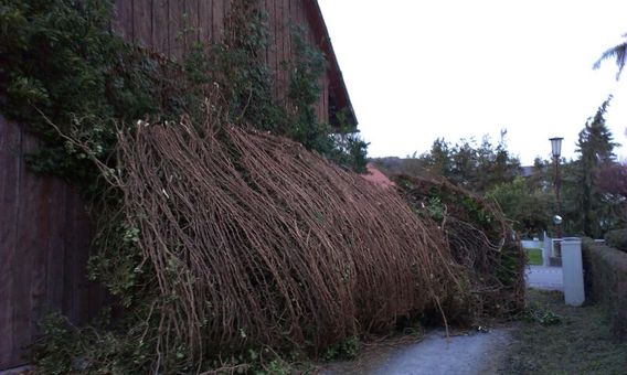 An einer Holzfassade hinaufwachsender Efeu hat sich aufgrund des Sturmes abgelöst und eine Hauszufahrt verlegt.