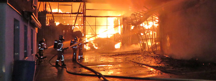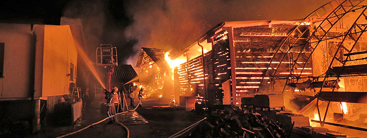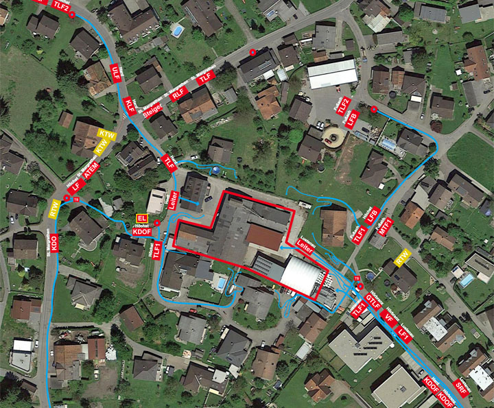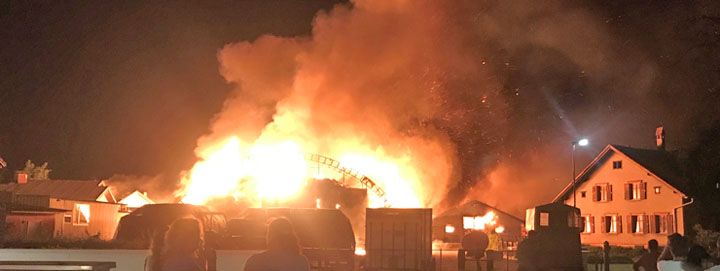 Am 22. August 2018, gegen 22:50 Uhr, wird die Feuerwehr Höchst nach einem lauten Knall alarmiert. Das Einsatzstichwort lautet: „F4 Großbrand Deltastraße“. Dieser Einsatz sollte als einer der größten in die Geschichte der Ortsfeuerwehr Höchst eingehen. Bei der RFL gehen über 130 Anrufe ein – die meisten ohne genaue Ortsangabe, lediglich mit dem Hinweis auf ein massives Feuer. Schließlich wird festgestellt, dass sich das Brandobjekt im Winkelweg befindet. Augenzeugen berichten von Flammen mit einer Höhe von fast 40 Metern. Der Feuerschein ist deutlich an der nahegelegenen Pfarrkirche sichtbar. LageBereits auf der Anfahrt sind starke Rauchentwicklung und eine immense Flammenwand weithin sichtbar. Einsatzleiter Kommandant HBM Pascal Hilbe erhöht die Alarmstufe und fordert über die RFL die Drehleitern der Feuerwehren Hard und Lustenau sowie die Feuerwehren Fußach und Gaißau zur Unterstützung an. Die Erkundung ergibt: Es handelt sich um ein landwirtschaftliches Anwesen mit Heulagerhalle, Stallgebäude, Zeltlagerhalle und Flugdach im Winkelweg. Das Objekt steht bereits in Vollbrand. Das Wohngebäude des Besitzers, das sich in unmittelbarer Nähe befindet, ist stark gefährdet. Auch die Wohnhäuser mehrerer Nachbarn sind durch die enge Bebauung bedroht. Die betroffenen Objekte umfassen eine Fläche von 90 × 40 Metern. Rund 600 Tonnen Heu und Stroh sind dort gelagert, teilweise bereits auf 11 Anhängern verladen. Die Strahlungswärme wirkt ungehindert auf Lagergut und Fahrzeuge ein. Eine Rettung weiterer landwirtschaftlicher Geräte in der Halle ist nicht mehr möglich. Zusätzliche Gefahren bestehen durch eine Hoftankstelle mit Diesel- und Heizöltank sowie eine Werkstatt mit Schweißgeräten. Aufgrund der Bausubstanz und der großen Menge an Heu und Stroh ist schnell klar: Die Gebäude müssen aufgegeben werden. Ein Innenangriff ist aus Sicherheitsgründen nicht vertretbar. Die zuerst eintreffenden Kräfte konzentrieren sich auf den Schutz des Wohnhauses und der Nachbargebäude. Das Vieh befindet sich glücklicherweise auf der Sommeralpe und ist nicht gefährdet. Das KDOF Höchst trifft als erstes ein, übernimmt die Einsatzleitung und bildet zwei Brandabschnitte. Aufgrund der starken Rauch- und Hitzeentwicklung ist eine Rundumerkundung schwierig. Daher fordert Einsatzleiter Hilbe das GTLF 8000/500/500 der Feuerwehr Hörbranz an – eine Entscheidung, die sich im weiteren Verlauf als absolut richtig erweist.