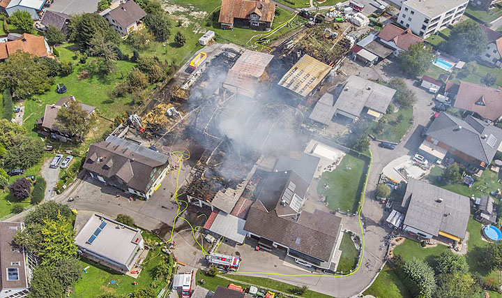 Unter Atemschutz erfolgt der Angriff. Die nahe Haustankstelle mit Diesel- und Heizöltank wird mit Schaum abgelöscht. Über die Drehleiter Lustenau erfolgt ein CAFS-Löschangriff. Die Wasserversorgung für das GTLF wird gesichert. ![]() WasserversorgungDie Druckverhältnisse im Hydrantennetz sind zunächst unzureichend (0,5 bis 1 bar). Wasser wird aus 11 Hydranten im Umfeld bezogen, unterstützt durch 4 TS1200. Zusätzlich wird Wasser aus Privatpools mittels Tauchpumpen entnommen. Das Wasserwerk Höchst erhöht sofort den Druck. Nach Inbetriebnahme der Notwasserversorgung durch die Gemeinde Lustenau verbessert sich die Lage deutlich. In den ersten vier Stunden liegt der Wasserverbrauch konstant bei 4.200 l/min, mit Spitzen bis 5.200 l/min. Erfreulicherweise gibt es keine defekten Hydranten. Auch nachdem der Brand unter Kontrolle ist, werden noch 1.000 bis 3.000 l/min benötigt, um Glutnester abzulöschen. Massiver AtemschutzeinsatzFür diesen Einsatz sind große Kräfte an Atemschutzgeräteträgern erforderlich. Unterstützung kommt von der Nachbarwehr St. Margrethen (Schweiz), die mit 28 Geräteträgern sowie TLF, ATEM, KDOF, Steiger und Rüstfahrzeug über die Staatsgrenze anrückt. Ein Atemschutzsammelplatz wird eingerichtet. Die Ortsfeuerwehr Fußach mit dem VFC sowie die Feuerwehr Mäder mit Atemluftfüllkompressor und 68 Stück 300-Bar-Flaschen stellen diesen in einer Halle bereit, die von einer Privatfirma zur Verfügung gestellt wird. Schweres GerätIn den frühen Morgenstunden werden Bagger und Radlader ortsansässiger Baufirmen angefordert. Einsturzgefährdete Gebäudeteile und Brandschutt werden abgetragen, um Glutnester zu erreichen. Große Mengen Heu und Stroh werden auf Hänger und LKW verladen und auf entfernte Riedstücke gebracht, wo sie weiter abgelöscht werden. ![]() NachlöscharbeitenErste Kräfte können bereits am Morgen abrücken. Die Nachlösch- und Aufräumarbeiten dauern noch drei Tage. Der Brandermittlungsdienst der Kriminalpolizei beginnt bereits am Vormittag mit der Analyse. ErkenntnisseTrotz gut ausgebautem Hydrantennetz muss das Wasserwerk die Förderung erhöhen und die Notwasserversorgung der Gemeinde Lustenau anfordern. Glücklicherweise flaut der seit Tagen vorherrschende Südwestwind am Abend ab und verhindert größeren Schaden. Durch Einbezug von Behörden wie Wasserwirtschaftsamt, Umweltanstalt und Abfallwirtschaftsamt wird nach Intervention von BFI Herbert Österle die Ausbringung des Brandgutes auf ein Riedstück ermöglicht. Dort erfolgt die letzte Durchnässung, das Heu kann verrotten und später untergepflügt werden. Die Zufahrt für Einsatzfahrzeuge ist durch enge Gemeindestraßen eine Herausforderung. Zusätzlich erschweren zahlreiche Schaulustige die Abstellmöglichkeiten. Enormer Sachschaden