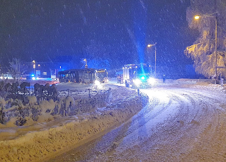 Aufgrund der Schneeglätte ist ein Gelenkbus von der Straße abgekommen und hängen geblieben.