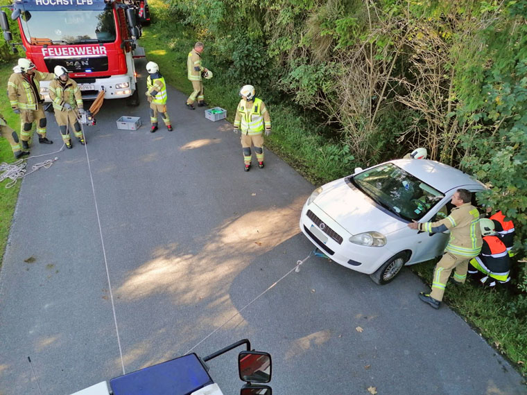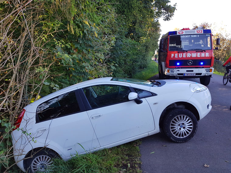 Ein PKW hat sich auf den Radweg am alten Rhein verirrt, beim Versuch umzukehren ist das Fahrzeug neben die Fahrbahn gekommen und blieb hängen.