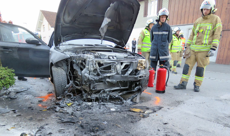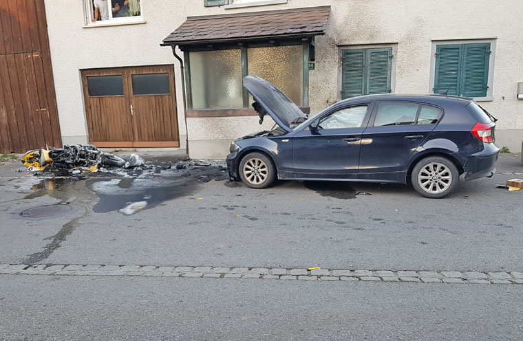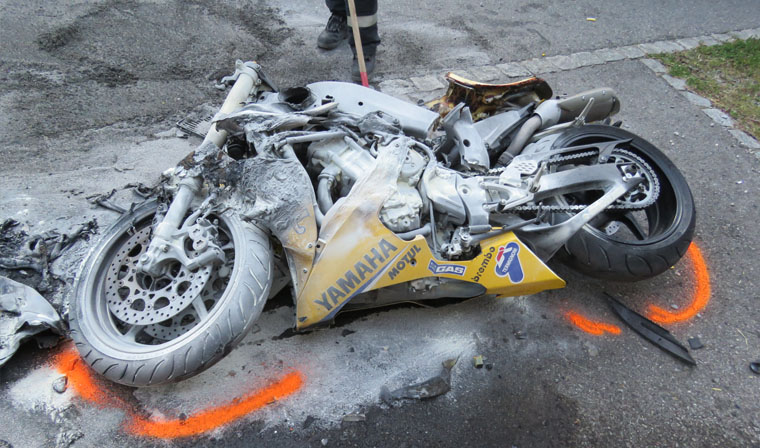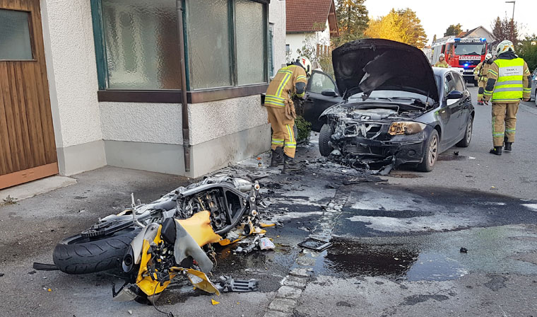 In Höchst ist ein Motorradfahrer aus bisher unbekannter Ursache zu Sturz gekommen. Das Motorrad rutschte in ein Auto hinein, woraufhin beide Fahrzeuge anfingen zu brennen. Ein Passant konnte das Feuer löschen.