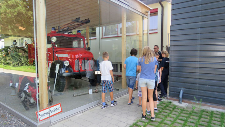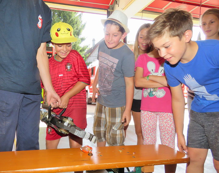 Hierbei lernten die Kinder alles was mit der Feuerwehr zu tun hat kennen. Nach der Vorstellung im Feuerwehrhaus ging es mit den Feuerwehrautos durchs Ortsgebiet. Nach der Rückkehr wurde bei einem technischen Einsatz der Umgang mit dem Kombigerät geübt. Zusätzlich wurde ein Garage eingenebelt, so dass auch der Brandeinsatz nicht zu kurz gekommen ist.