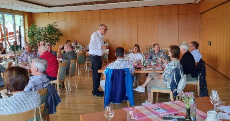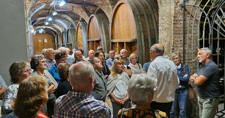 Wilfried Leiter, unser bewährter Fahrer, lenkte den voll besetzten Bus mit 54 Teilnehmerinnen und Teilnehmern zuerst nach Hagnau. Dort wurden wir von Roland Gotterbarm begrüßt. Dieser führte uns in die Räumlichkeiten des Winzervereines Hagnau.