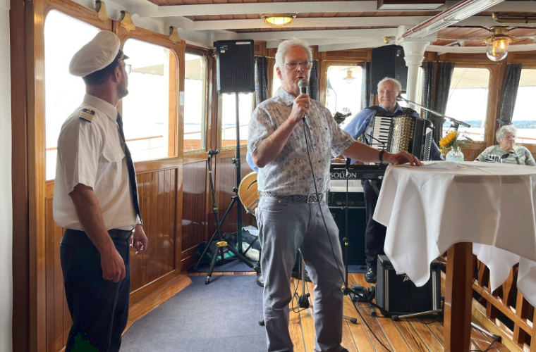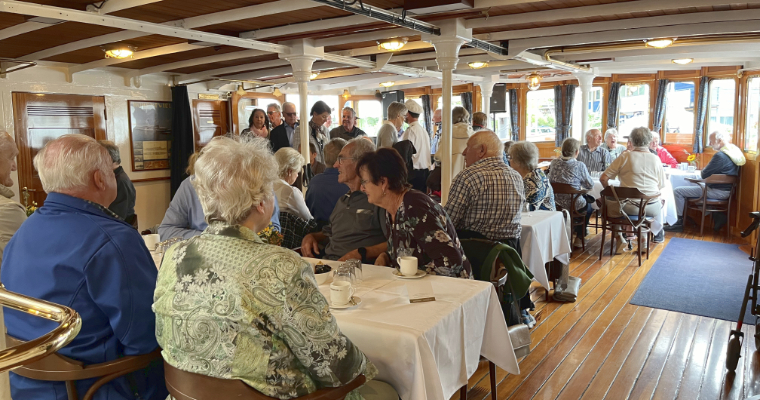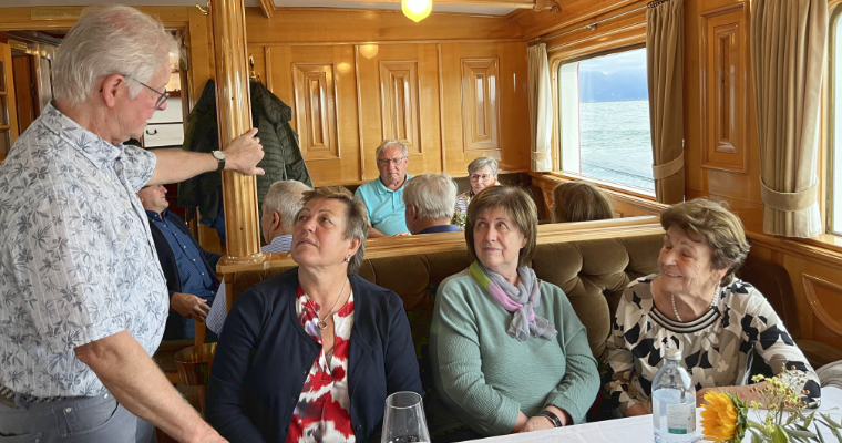 Bei anfänglichem Sonnenschein legte das Dampfschiff pünktlich um 12.15 ab. Föhnwind bescherte bei Beginn der Rundfahrt bereits kräftigen Wellengang. Dieser machte dem Dampfschiff bei Fahrt jedoch keine Schwierigkeiten. Die Gäste an Bord wurden in verschiedenen Bereichen des Schiffes untergebracht. Nach der Begrüßung durch Obmann Burghard Bereuter und Kapitän Felix Brandauer, der die Crew vorstellte, wurde Kaffee und Zwetschkenstrudel serviert.