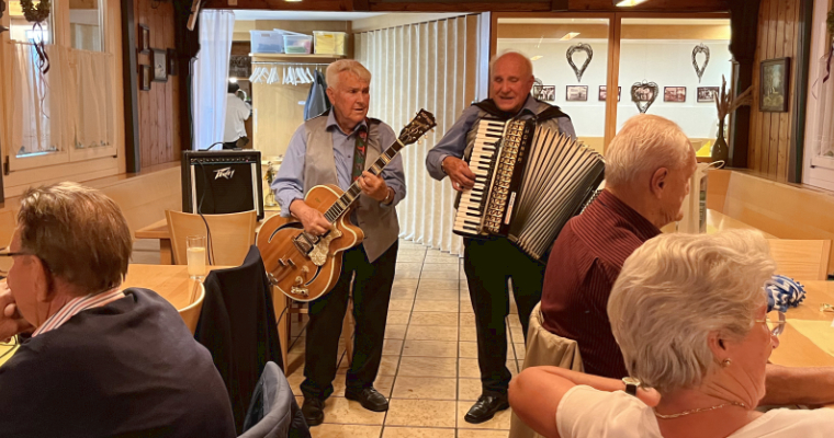 Bald schon entwickelten sich anregende Gespräche an den Tischen und weitere Getränke wurden schon rasch serviert. Zur Unterhaltung musizierte die Abordnung des ehemaligen „Blum Trio´s“, Arno und Heinz Blum. Die Musikanten spielten auf Initiative von Helmut Gassner ohne Gage für die Gäste an Bord, wofür sich Obmann Bereuter bei Helmut und den Musizierenden herzlich bedankte.