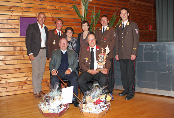 Der zweite Jubilar, Bernhard Ruepp, ist bereits 40 Jahre Feuerwehrmann. Sein Engagement in unserer Wehr ist beispielgebend, war er doch lange Jahre Kassier und der erste Leiter unserer Feuerwehrjugend. Zahlreiche Wettkämpfe und sportliche Aktivitäten sowie Kursbelegungen an der Feuerwehrschule zeugen von seinem Idealismus für die Feuerwehr. Bernhard wurde mit der Verdienstmedaille des Verbandes in Silber und einem geschnitzten Florian ausgezeichnet, die Gattinnen der Jubilare erhielten vom Kommandant ein Blumengebinde für ihr langjähriges Verständnis.