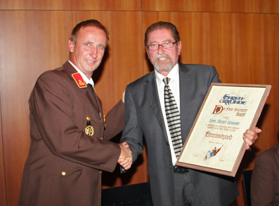 Über 25 Jahre als Bürgermeister der Gemeinde Höchst bedeutet auch, über 25 Jahre der Chef der Ortsfeuerwehr. Wenn man so in Gedanken die vergangenen Jahre Revue passieren lässt, erinnert man sich an zahlreiche Begebenheiten, die unseren Altbürgermeister Ing. Werner Schneider mit unserer Feuerwehr verbindet. Dieser Kameradschaftsabend soll dazu dienen, auch den jüngeren Mitglieder das Wirken unseres ehemaligen Gemeindeoberhaupts näherzubringen. So wurden während seiner Amtszeit die meisten Feuerwehrfahrzeuge, die jetzt in der Garage stehen, angeschafft. Nur der Tank 1 ist ein wenig älter. Werner war ebenfalls vorne mit dabei, als 1995 das Landesfeuerwehrfest nach Höchst geholt wurde. Zahlreiche Sitzungen und Besprechungen waren in dieser langen Zeit notwendig, um die nicht immer leichte finanzielle Situation an das Budget anzupassen oder umgekehrt, wenn es sein musste. Die längst fällige Restauration des Gerätehauses fiel in seine Legislaturperiode, ebenso die laufende Erweiterung der Stillen Alarmierung. Ein weiterer Meilenstein in der Zusammenarbeit mit der Feuerwehr war die neue Uniformierung unserer Mannschaft, und das sage und schreibe gleich 4 mal! Bei Bränden und anderen Einsätzen war Werner stets zugegen und stand mit Rat und Tat zur Seite, wenn es erforderlich war. Werners besonnene Art und seine Handschlagqualität machten ihn zu einem tollen Partner für unsere Wehr und unsere Interessen. Werner hatte für die Belange der Sicherheit in der Gemeinde und speziell für die Feuerwehr stets ein offenes Ohr. Und ganz besonders freut uns natürlich, dass durch seine Gattin, unsere Fahnengota Ursula, immer eine Verbindung zu seiner Feuerwehr bestehen wird. Der Feuerwehrausschuss hat einstimmig beschlossen, Ing. Werner Schneider für seine Verdienste um die Feuerwehr Höchst zum Ehrenmitglied zu ernennen.