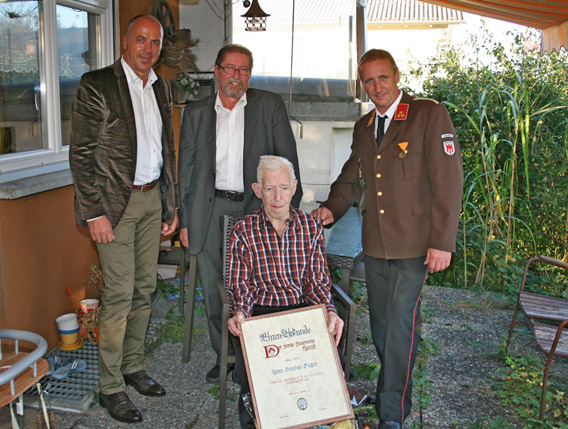 Benedikt Gugele, von allen Kameraden nur Benne genannt, war als gebürtiger Dornbirner bereits 11 Jahre bei der Dornbirner Feuerwehr, bevor es ihn nach Höchst verschlug und er unserer Wehr beitrat. Benne war in jüngeren Jahren ein Feuerwehrmann mit Leib und Seele, und unvergessen sind Einsätze, bei denen sein Wagemut nicht zu übertreffen war. Wir alle können nur bestätigen, dass man sich auf Benne jederzeit verlassen konnte, jahrzehntelang führte er die Kantine im Feuerwehrhaus und er verbracht unzählige Stunden damit, seine Kameraden bestens zu bewirten und hinterher auch noch blitzblank aufzuräumen. Benne wurde im Jahre 1988 zum Ehrenmitglied ernannt und erhielt für seine langjährige Wehrzugehörigkeit im Jahre 2003 die Feuerwehrmedaille in Gold. Benne konnte heute krankheitsbedingt leider nicht dabei sein, der Kommandant gratulierte ihm auf diesem Wege zum Jubiläum.