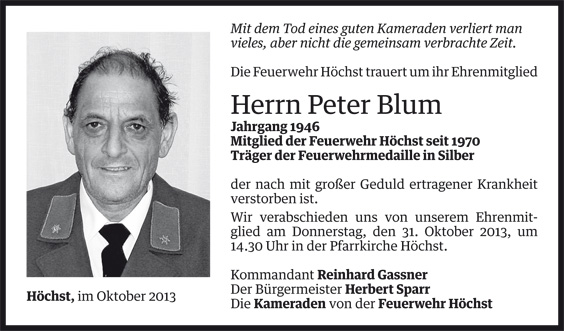 Wie viele Stunden seiner oft spärlichen Freizeit Peter in dieser langen Zeit für die Feuerwehr und die Höchster Bevölkerung geleistet hat, steht in keinem Protokoll und lässt sich wohl nur erahnen. Unvergessen sind auch seine Aktivitäten als Kränzlegruppenleiter, als er seine Kameraden und Gäste mit aufwändigen Dekorationen und kulinarischen Köstlichkeiten verwöhnte.