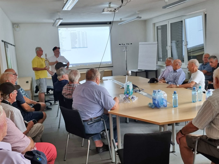 Am Ende der Besichtigung bedankte sich der Obmann bei Dieter Steinkellner mit einer guten Flasche Selbstgebranntem und lud anschließend alle Teilnehmer zu einem gemütlichen Hock ins Walhalla-Stüble nach Lustenau ein.